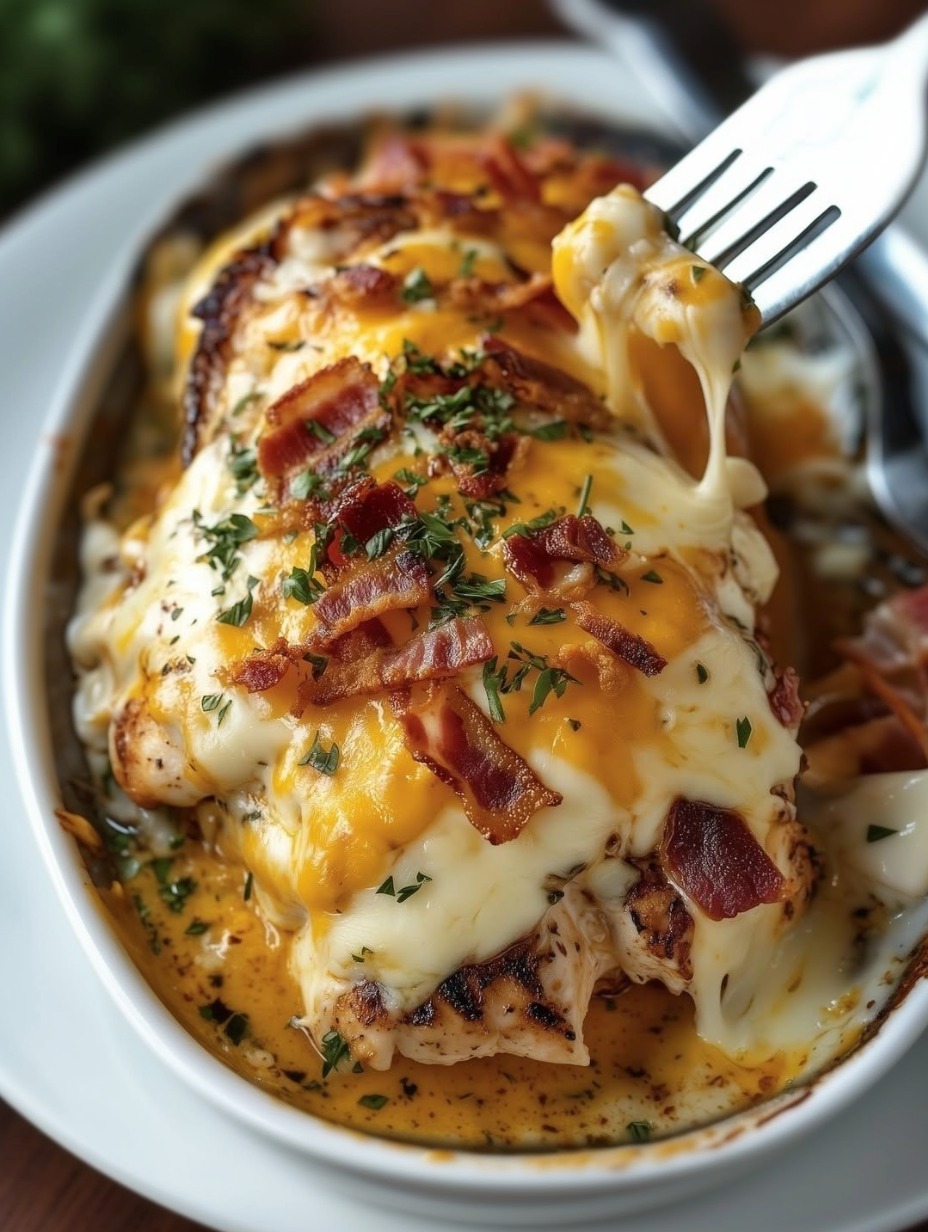 This iconic dish features tender, seasoned chicken topped with smoky bacon, melted cheddar, and fresh green onions. It’s a crowd-pleaser that’s easier to make at home than you might think!