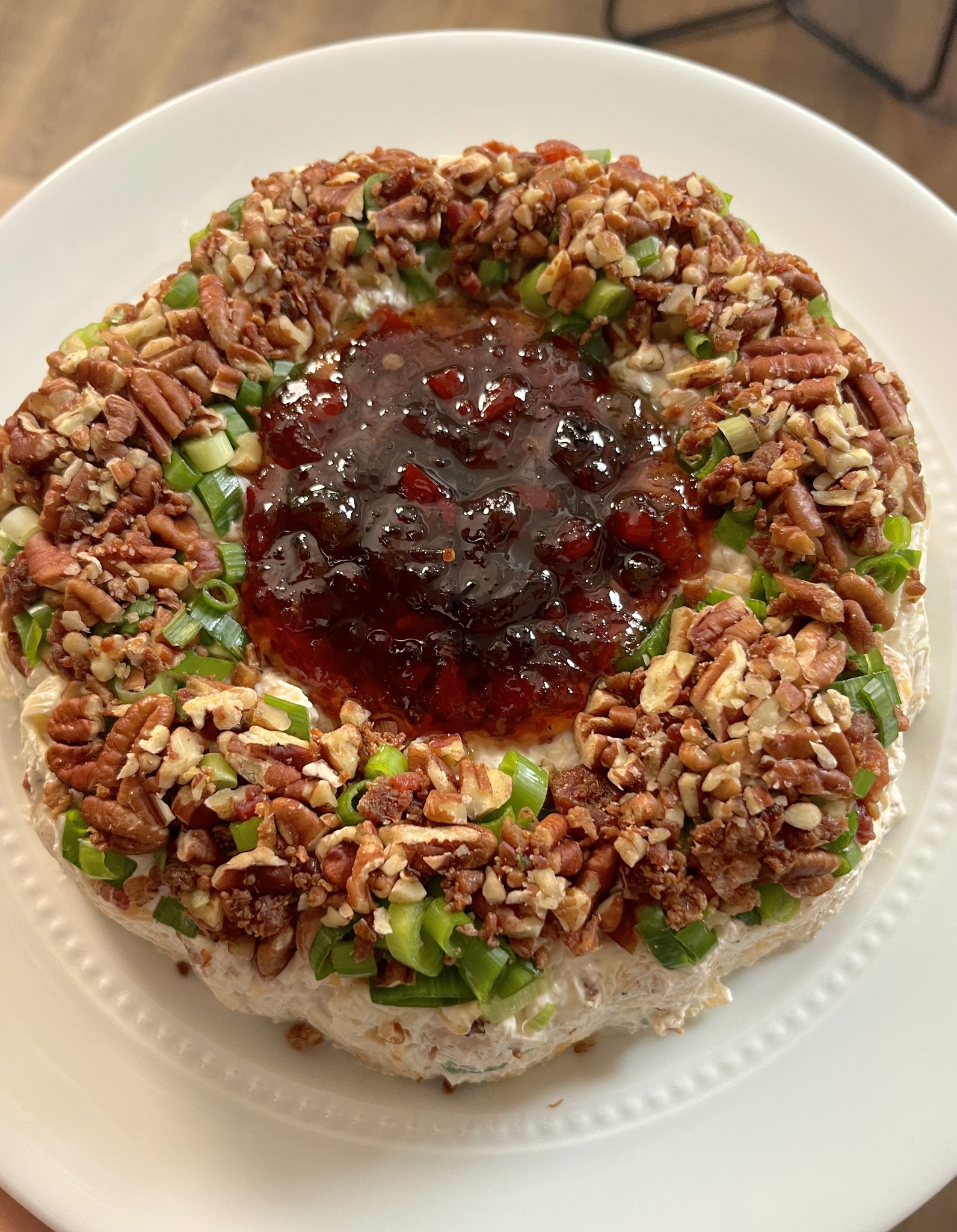 This stunning, make-ahead cheese spread is always the star of the party. A creamy, savory cheese mixture is molded into a ring with a crunchy pecan and bacon topping, then served with a sweet and spicy pepper jelly for the perfect bite.