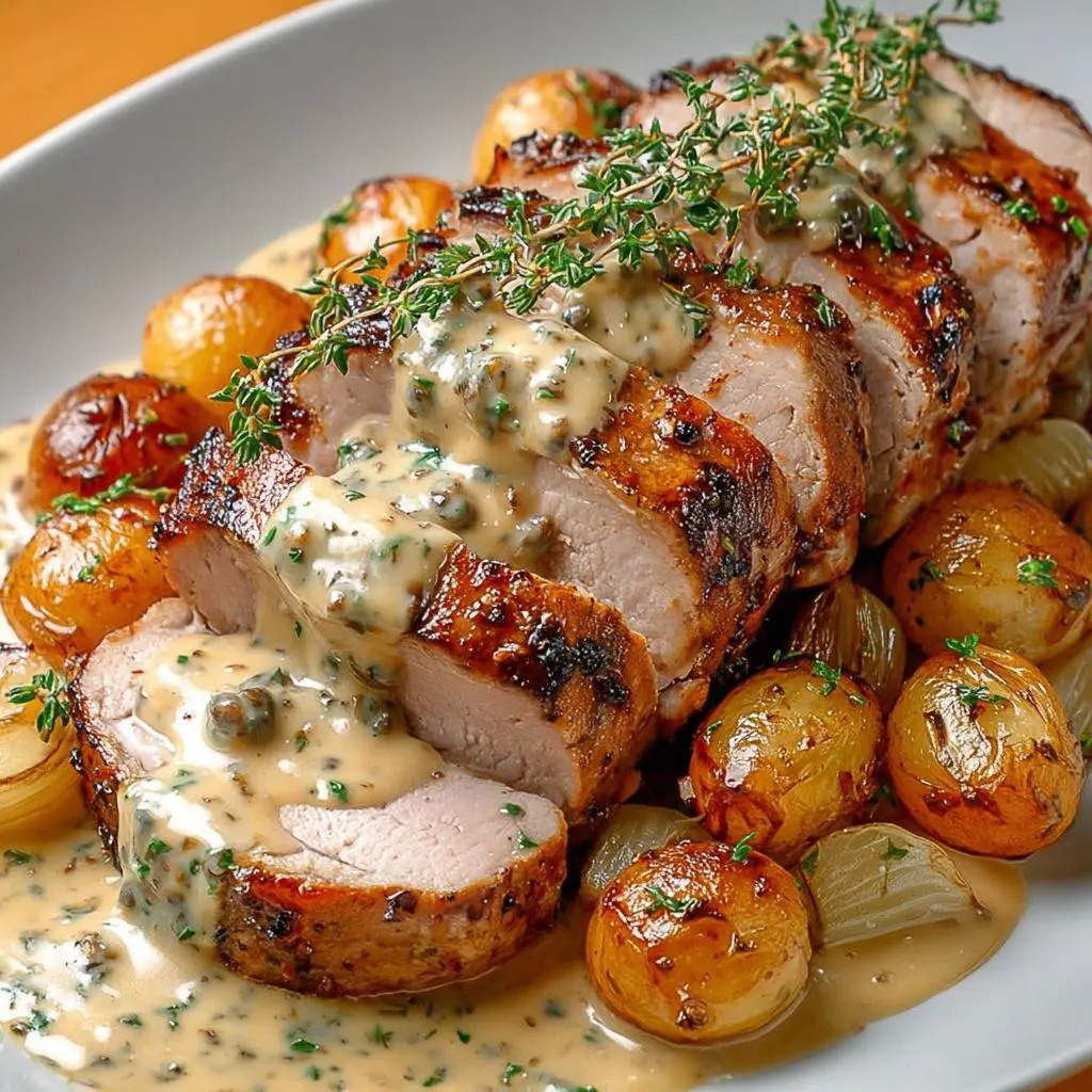 Roasted Pork Tenderloin with Old-Fashioned Mustard and Melting Onions