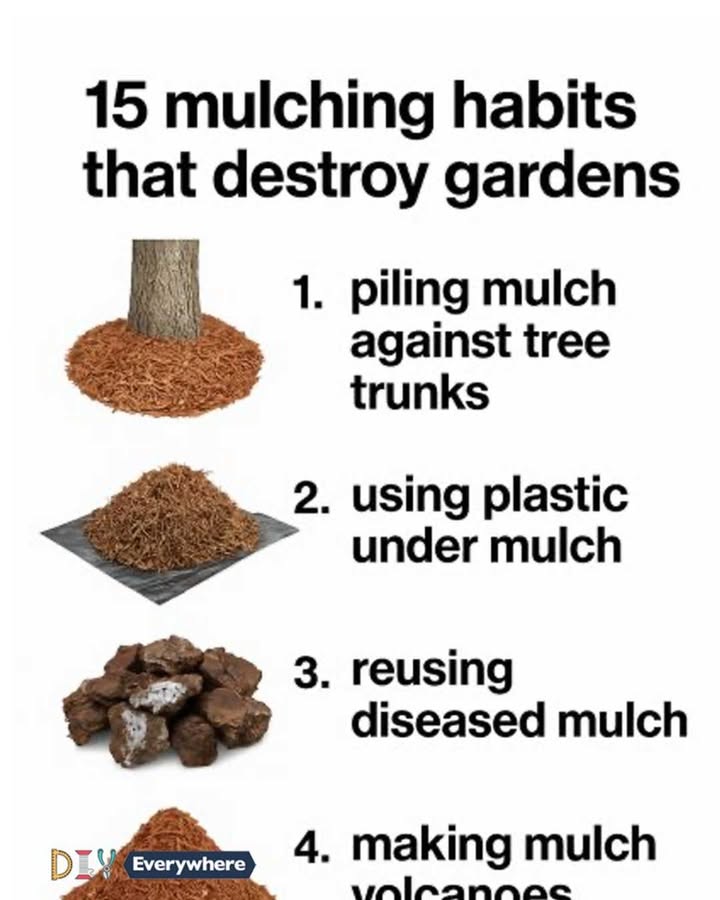 • Why it’s harmful: Mulch piled against stems or trunks causes rot, pest infestations, and disease.