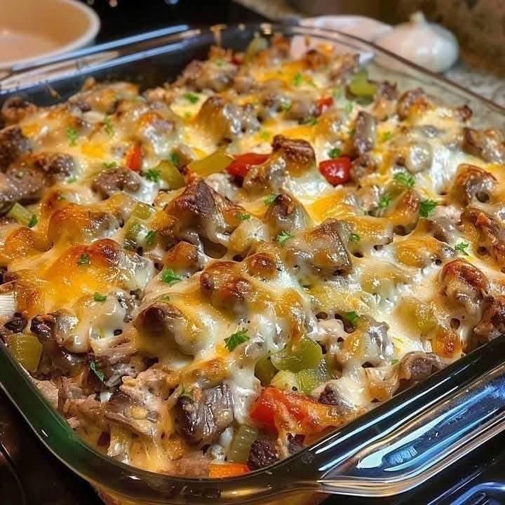 A deconstructed take on the classic sandwich, this easy casserole is packed with savory ground beef, tender peppers and onions, and a rich, cheesy egg bake.